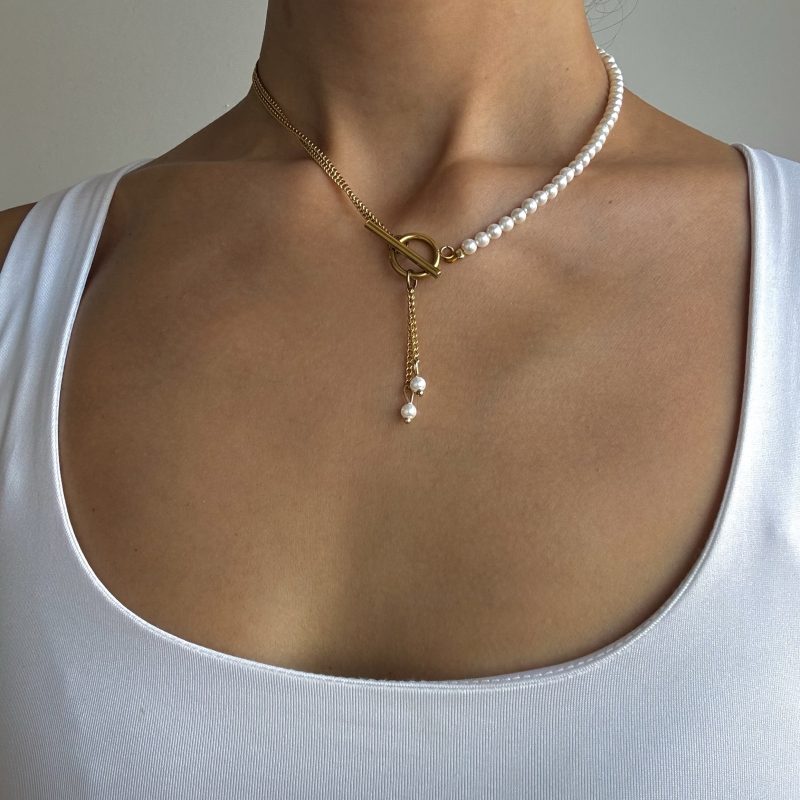 მასალა – მაიორკა მარგალიტი, ანტიალერგიული ჯაჭვი და შესაკრავი, ფერის დაცვით