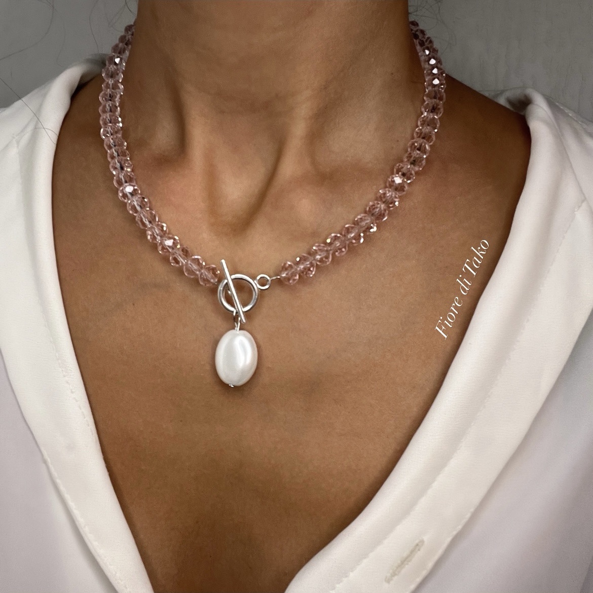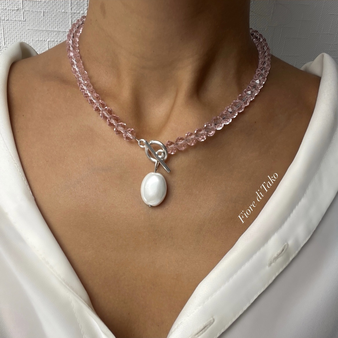 მასალა – კრისტალი, მაიორკა მარგალიტი, ანტიალერგიული შესაკრავი, ფერის დაცვით.