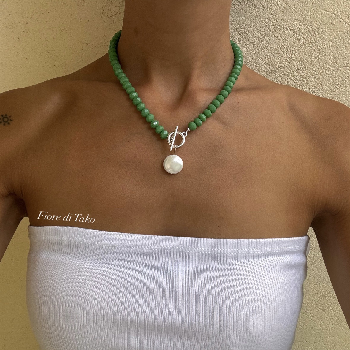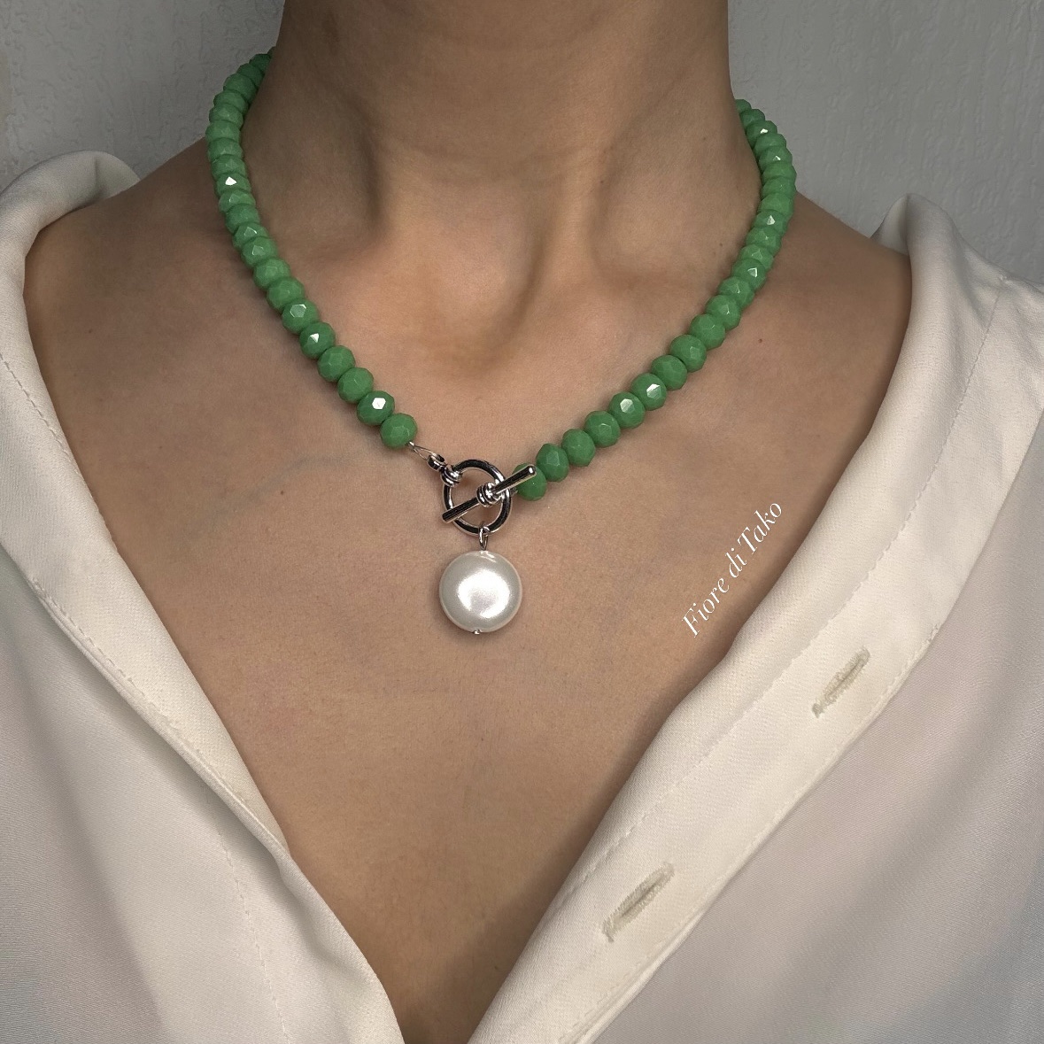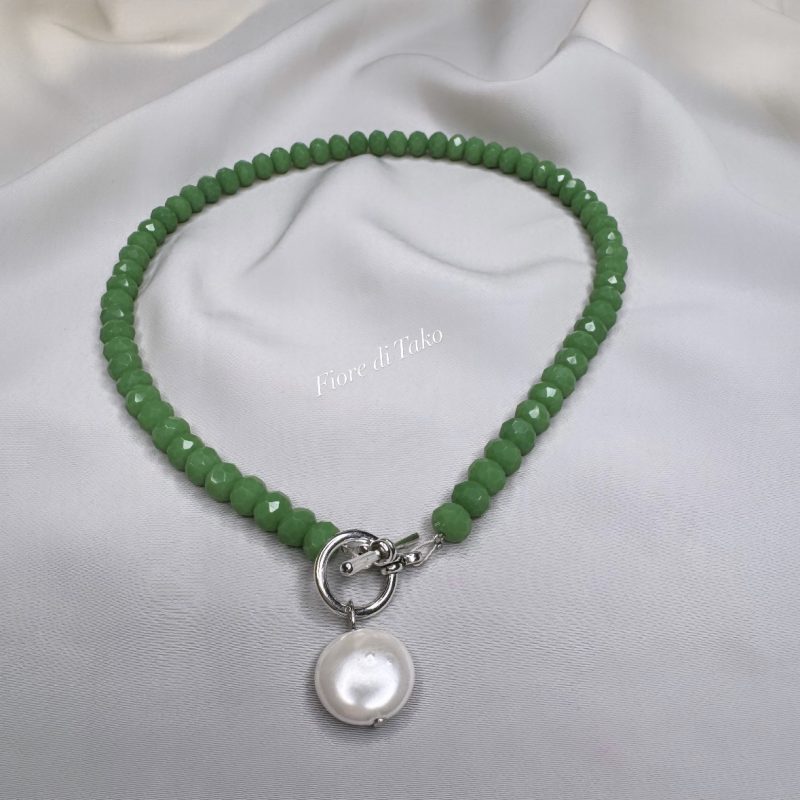 მასალა – კრისტალი, მაიორკა მარგალიტი, ანტიალერგიული შესაკრავი, ფერის დაცვით.