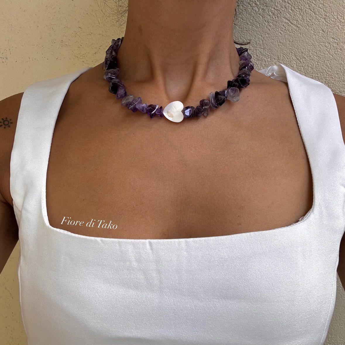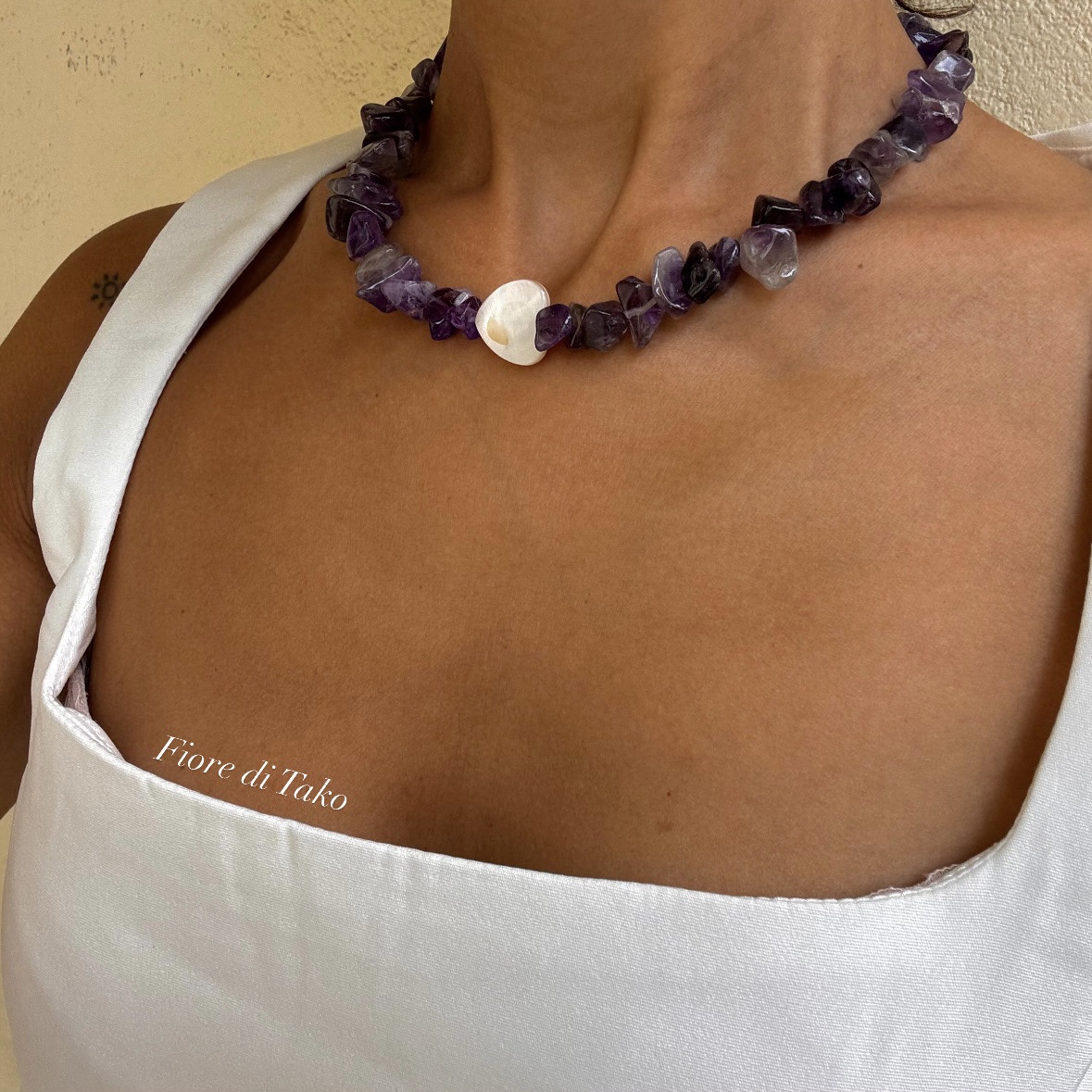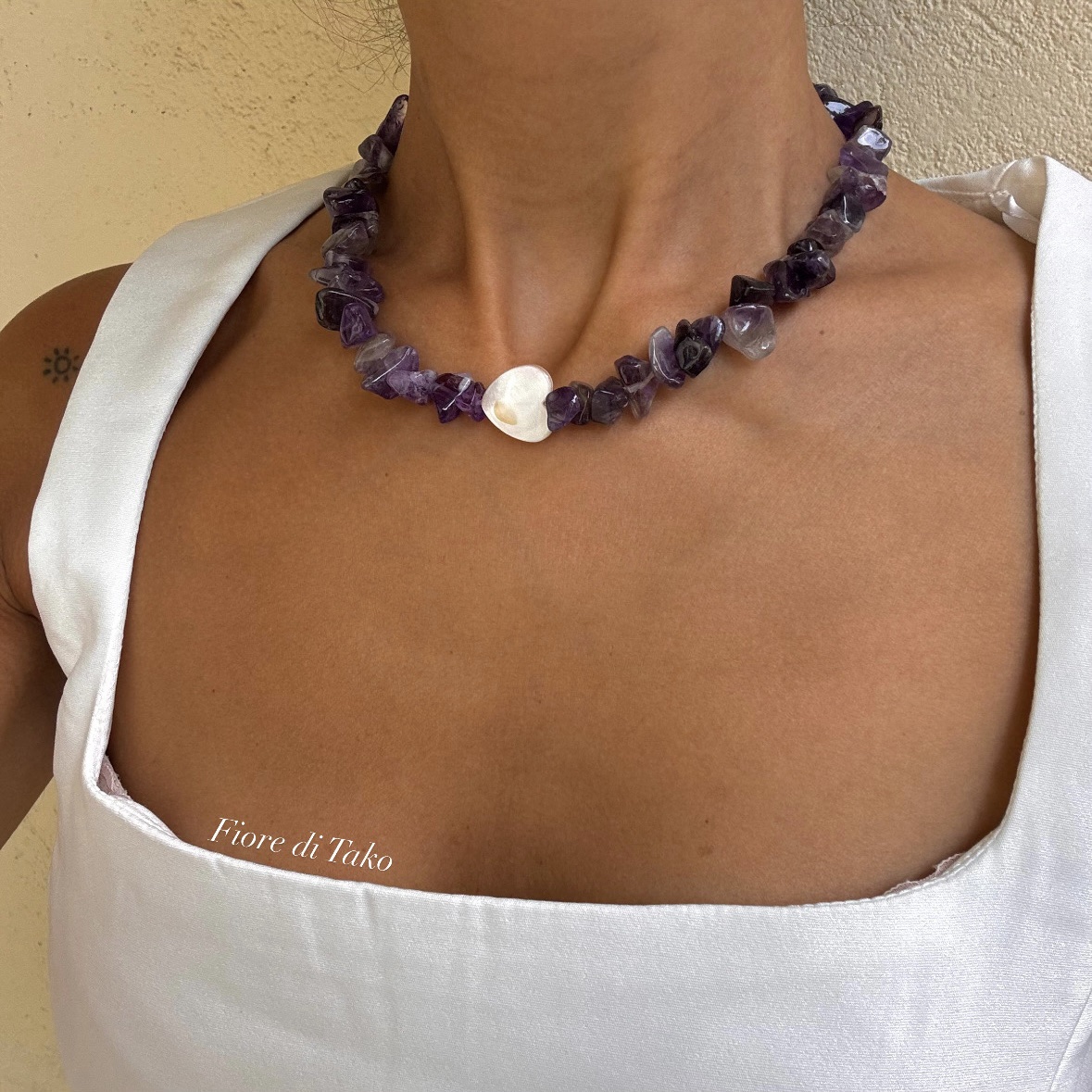 მასალა – ამეთვისტო, სადაფი, ანტიალერგიული შესაკრავი, ფერის დაცვით.