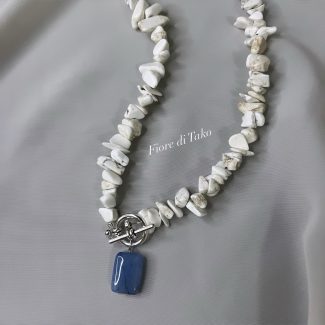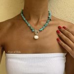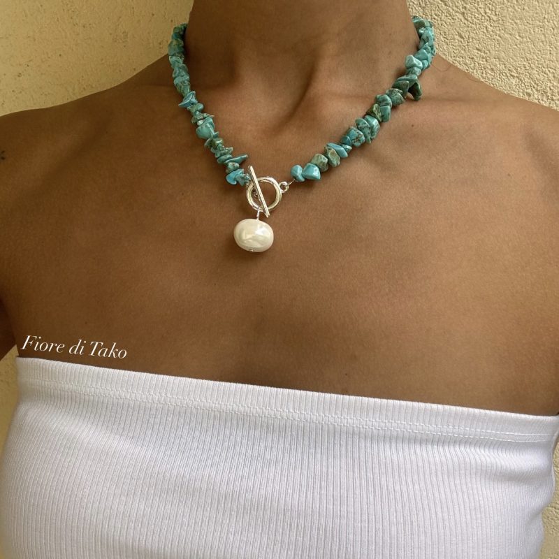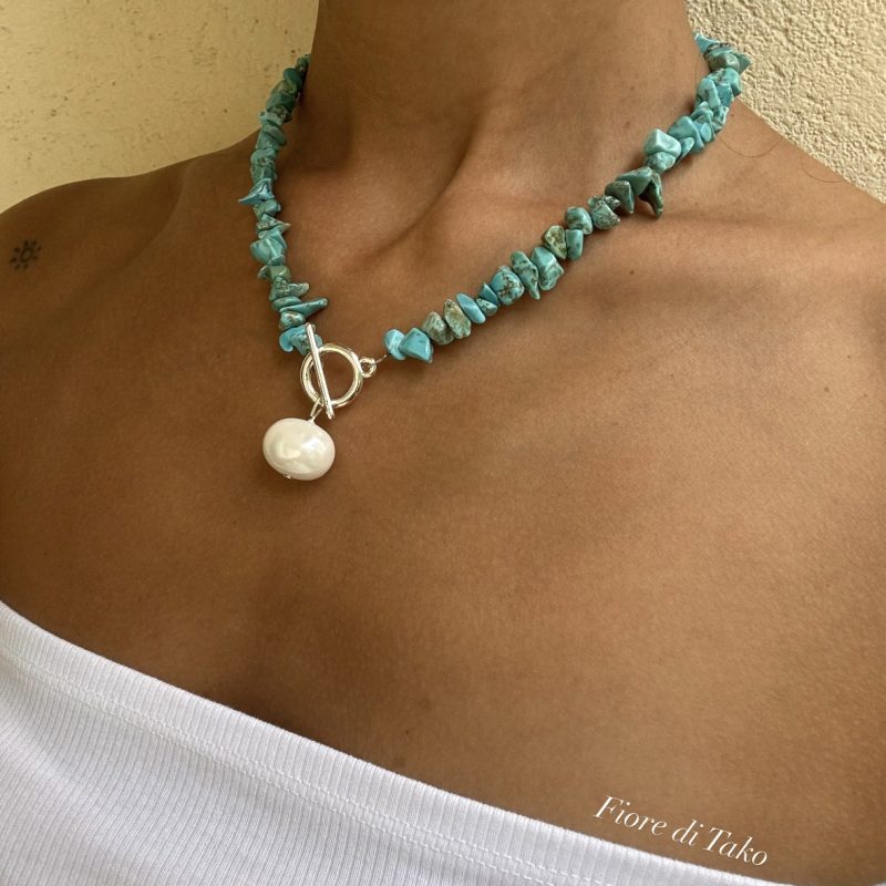 მასალა – ტონირებული ფირუზის პრესი, მაიორკა მარგალიტი, ანტიალერგიული შესაკრავი, ფერის დაცვით.