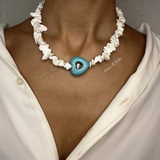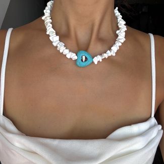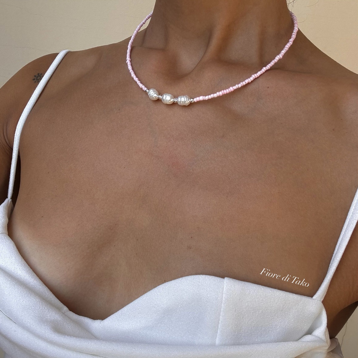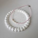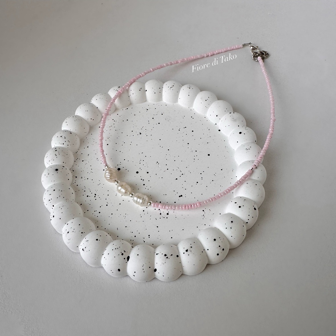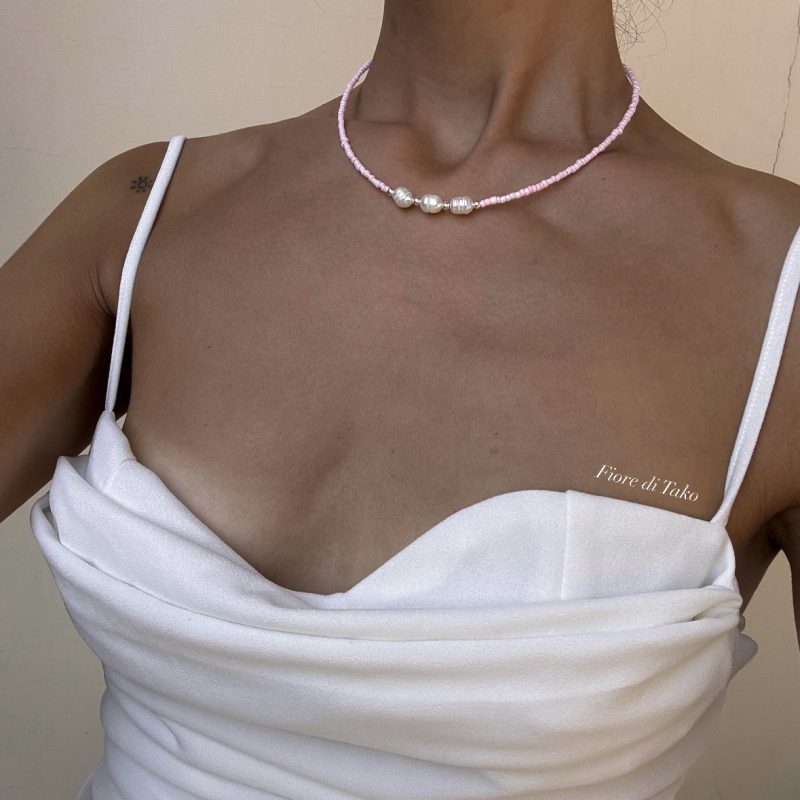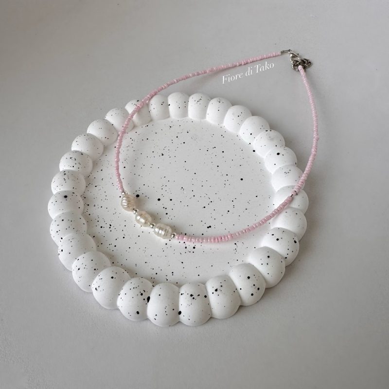 მასალა – ტონირებული ბისერი, მდინარის მარგალიტი, ანტიალერგიული შესაკრავი, ფერის დაცვით.