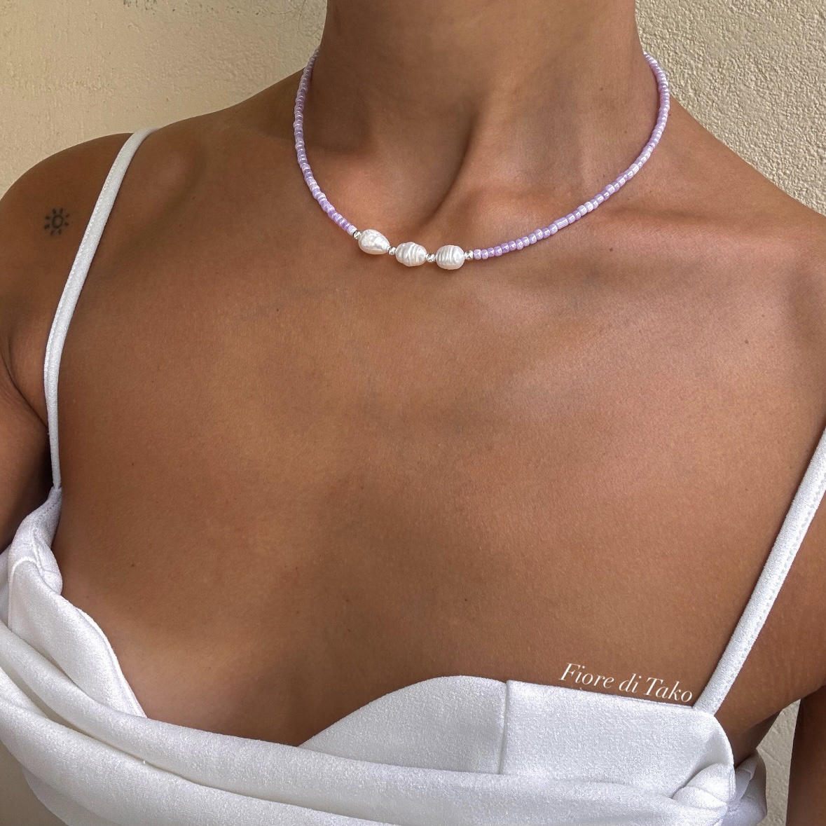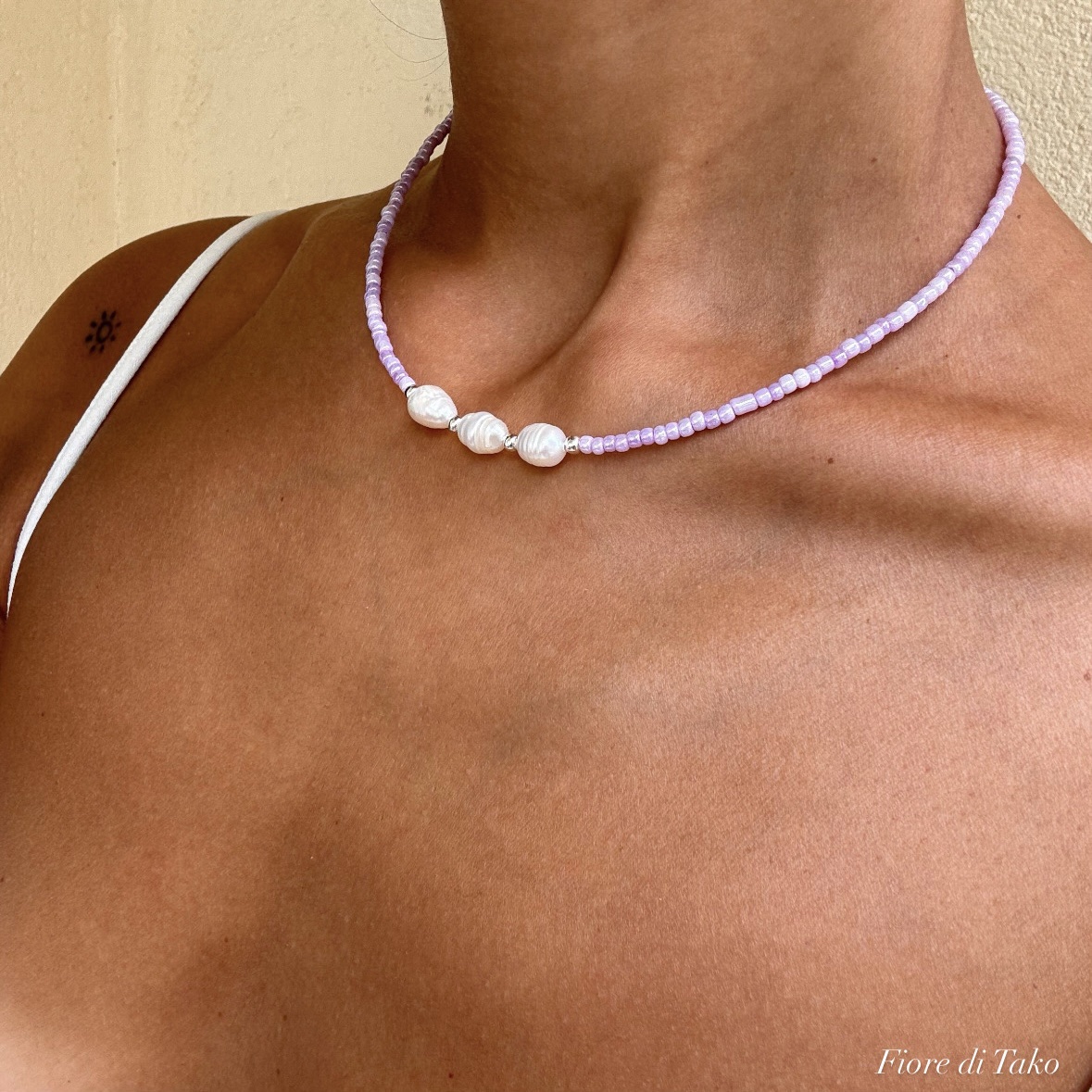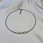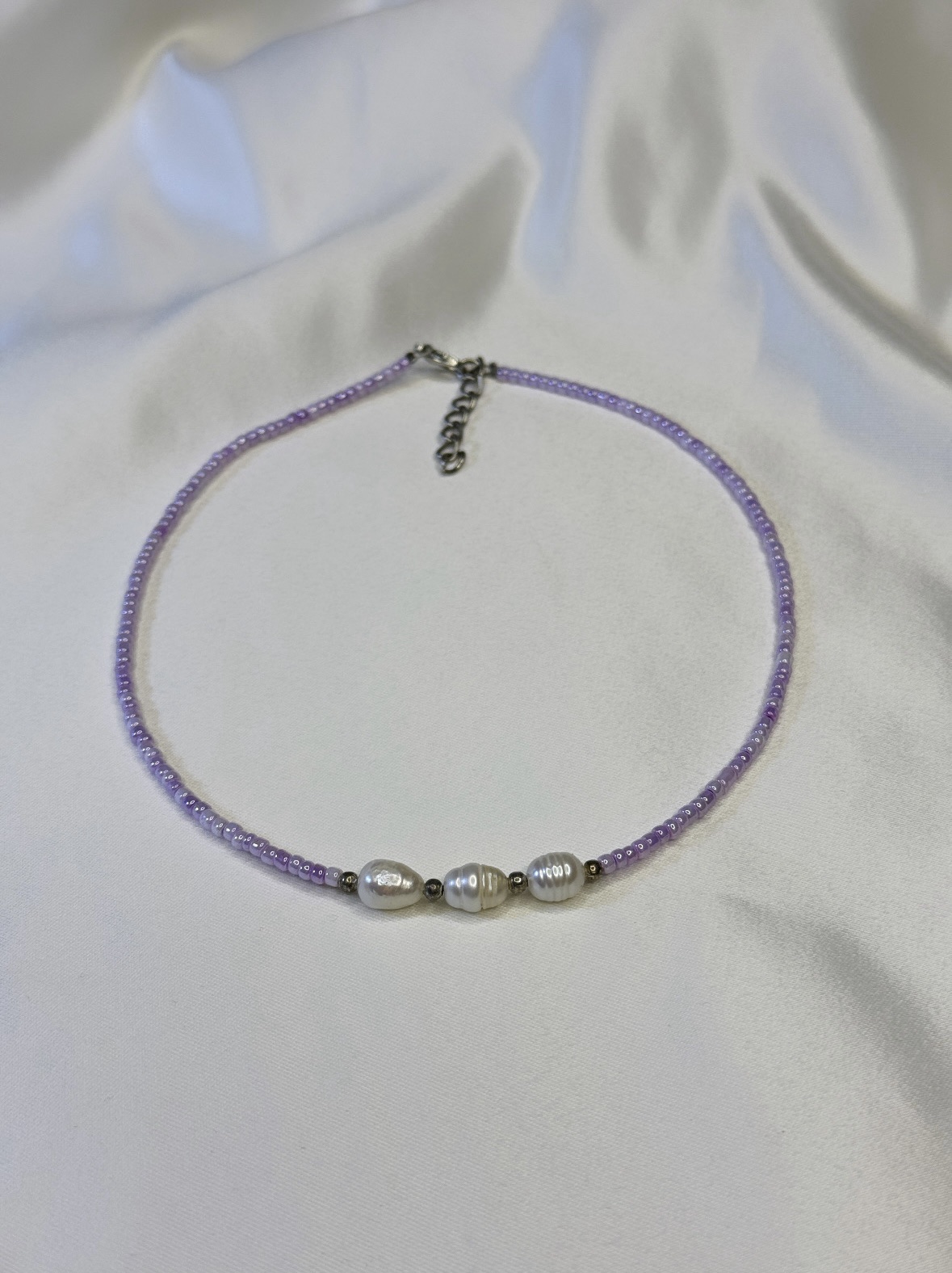 მასალა – ტონირებული ბისერი, მდინარის მარგალიტი, ანტიალერგიული შესაკრავი, ფერის დაცვით.
